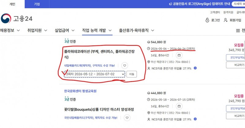 고용24에서 훈련과정을 검색을