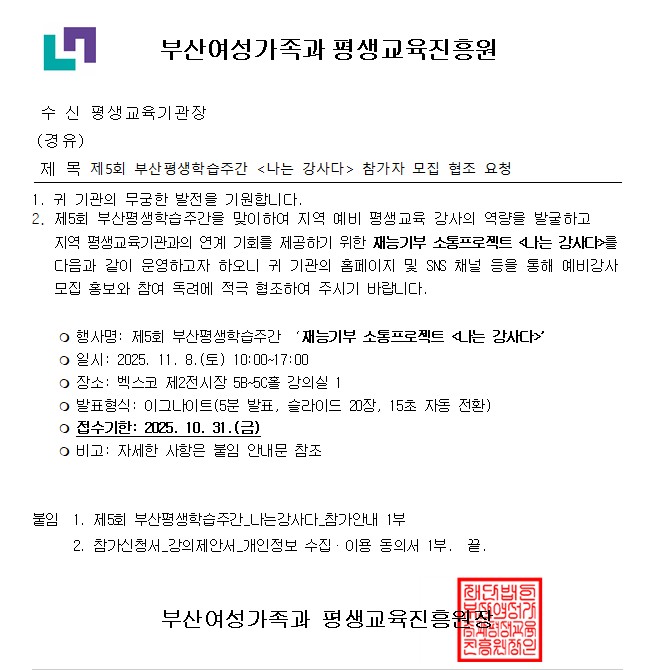 ※ 파일명 예시: 제5회 부산평생학습주간_나는강사다_ㅇㅇㅇ(이름)