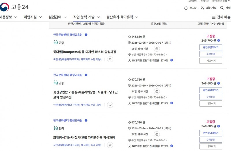 국민내일배움 훈련과정 >>> 직종검색(농림어업. 농업.화훼장식.단위화훼장식) >>>지역 검색 (부산시. 해운대구)